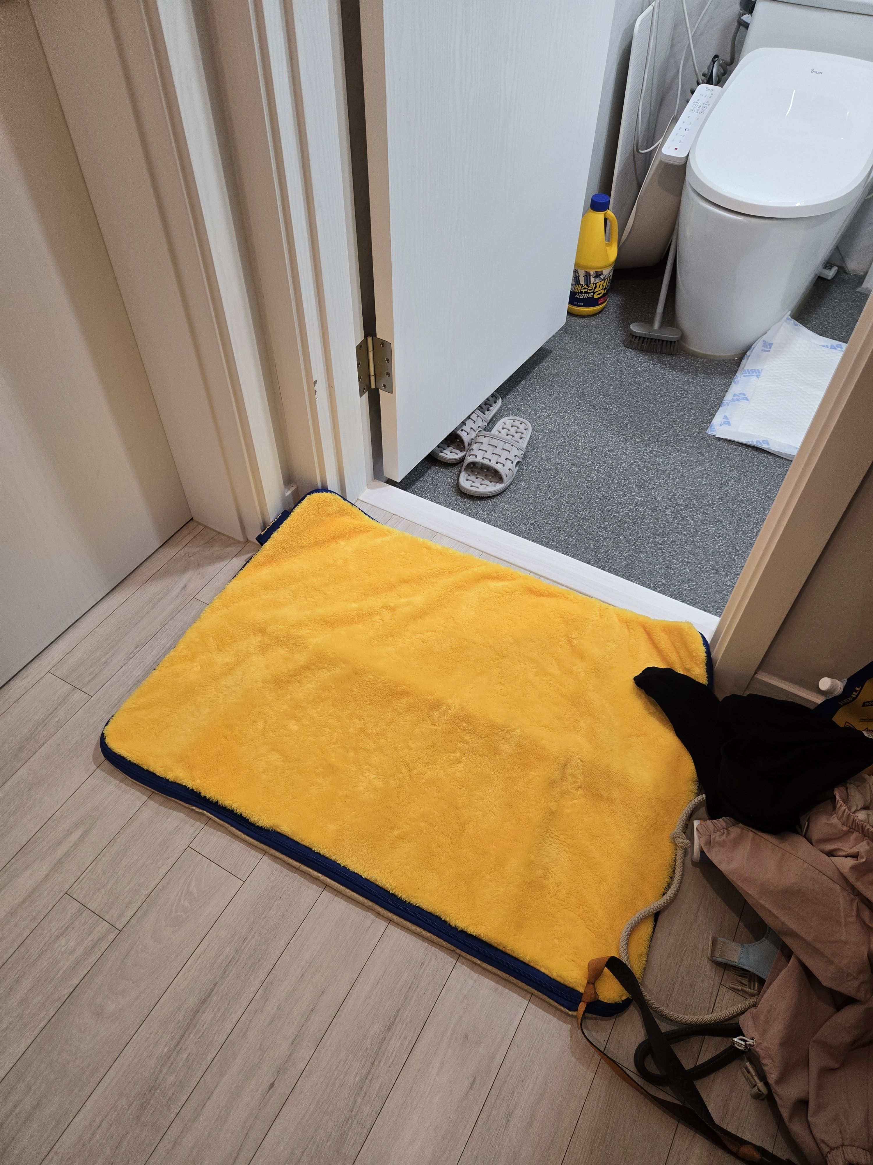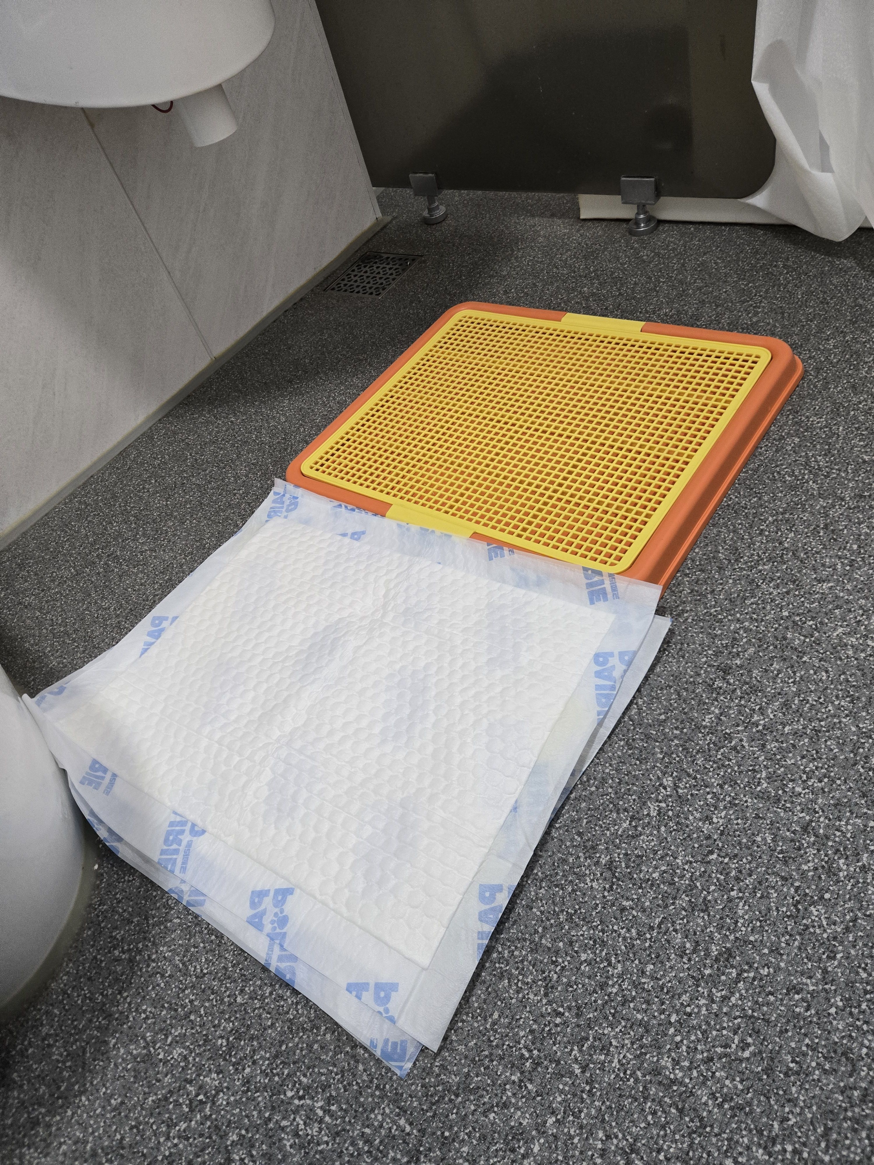 드라이매트에서 간식 몇번 먹이고 브러시질하고 저기에 뒀더니 저기에 싸지는 않고 발도장을 저기서 충분히 제거 되는 것 같다