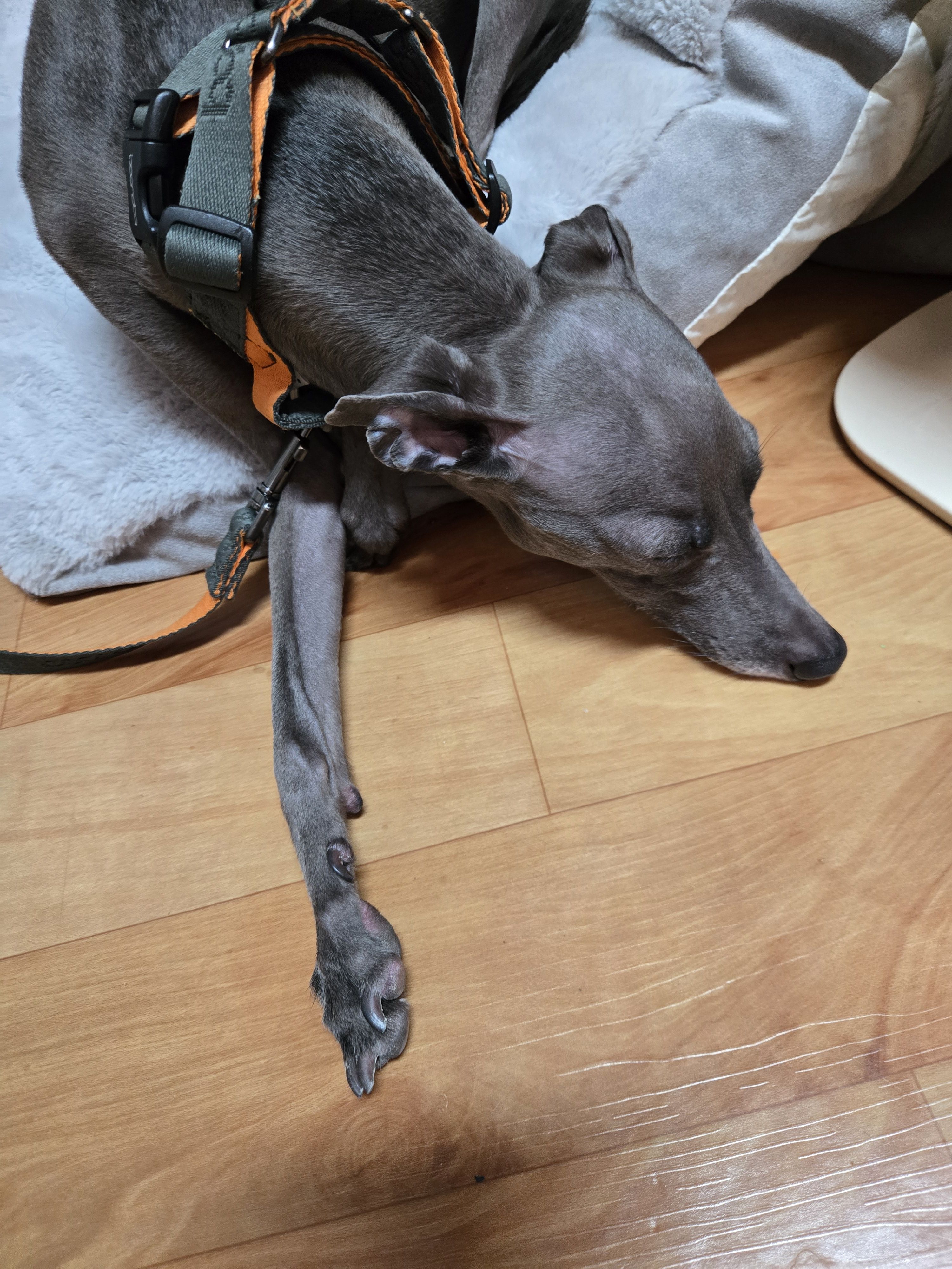 목줄 처럼 쓰던 하네스가 옷 안입으면 헐렁해서 제다로 채우니 이건 가슴쪽이 조이나보다 얌전히 있다가 뒤늦게 불편한지 자꾸 쓰다듬어달라고 조그맣게 짖기 까지 했다