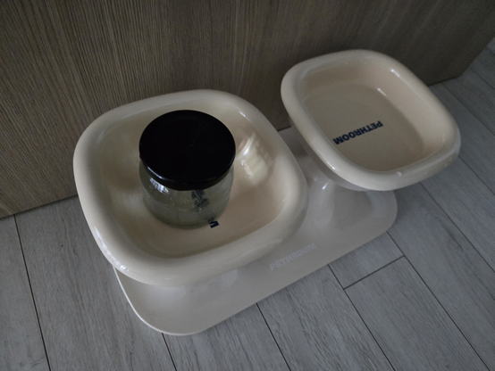 사료라도 천천히 먹으라고 가운데 유리병에 물 채워서 둬봤다. 일단 조금은 천천히 먹게 되는 듯